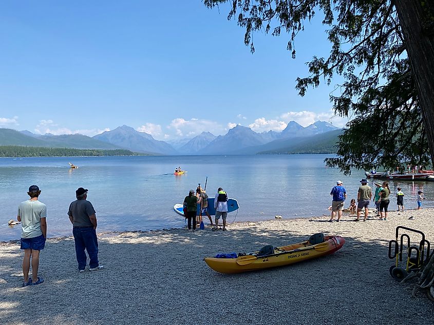 Des gens de tous âges attendent de lancer leurs différentes embarcations à pagaies dans les eaux calmes du lac McDonald. Photo : Andrew Douglas
