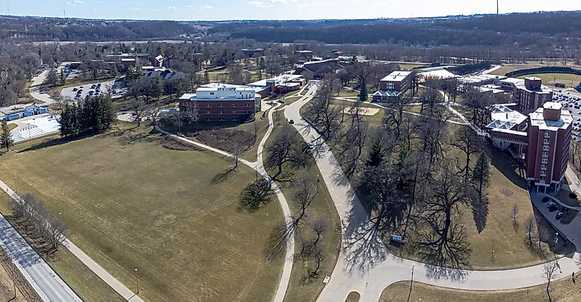 Vue aérienne du Luther College avec pistes cyclables à Decorah, Iowa. Par Wikideas1 – Travail personnel, CC0, Wikimedia Commons.